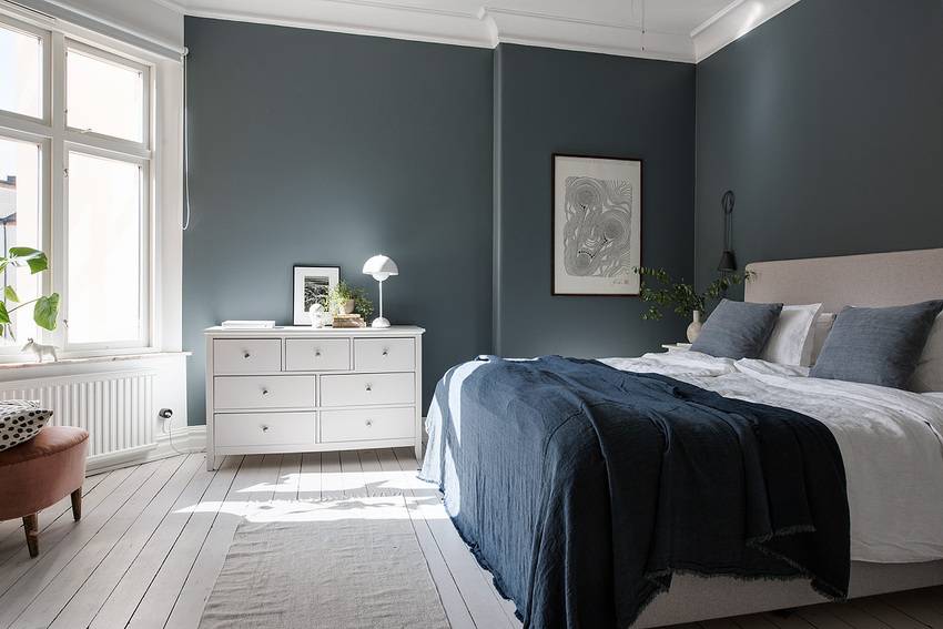 Скандинавский стиль не имеет строгих ограничений, поэтому дизайнеры часто используют цветовые акценты в интерьере спальни. Контрастный цвет на одной из стен сделает дизайн более сложным и привлекательным. Для реализации этой задумки используют краску или обои.