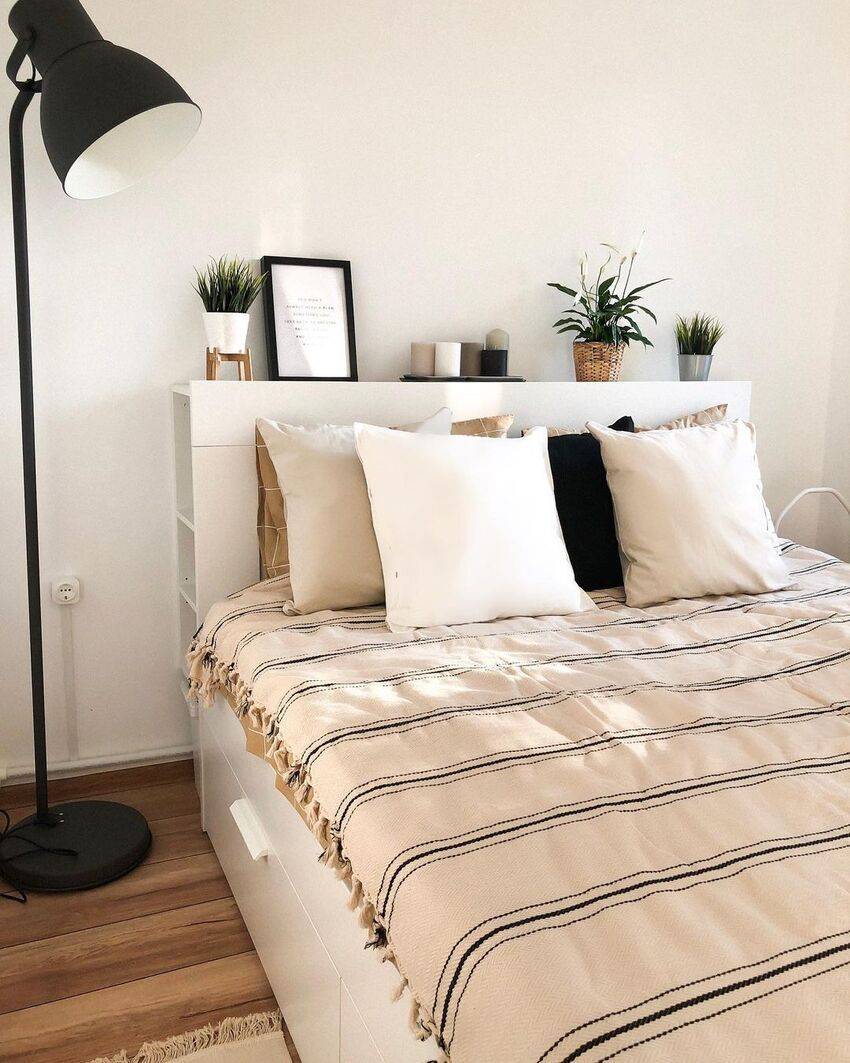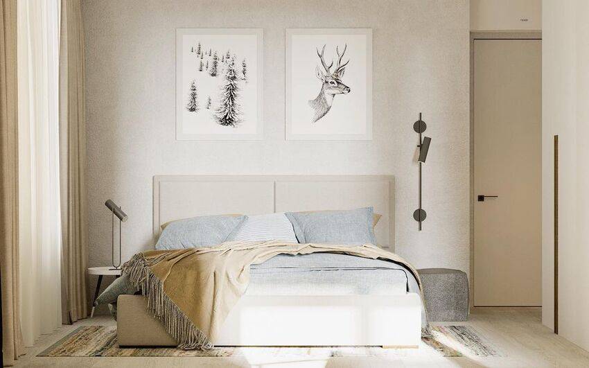 Стерильность нейтрального светлого фона помещения разбавляется единичными яркими акцентами: текстиль, прикроватные коврики, плафоны световых приборов, подушки на кровати, картины с абстракцией в лаконичных рамках из дерева. Здесь главное не переборщить, иначе теряется вся эстетика и очарование простоты.