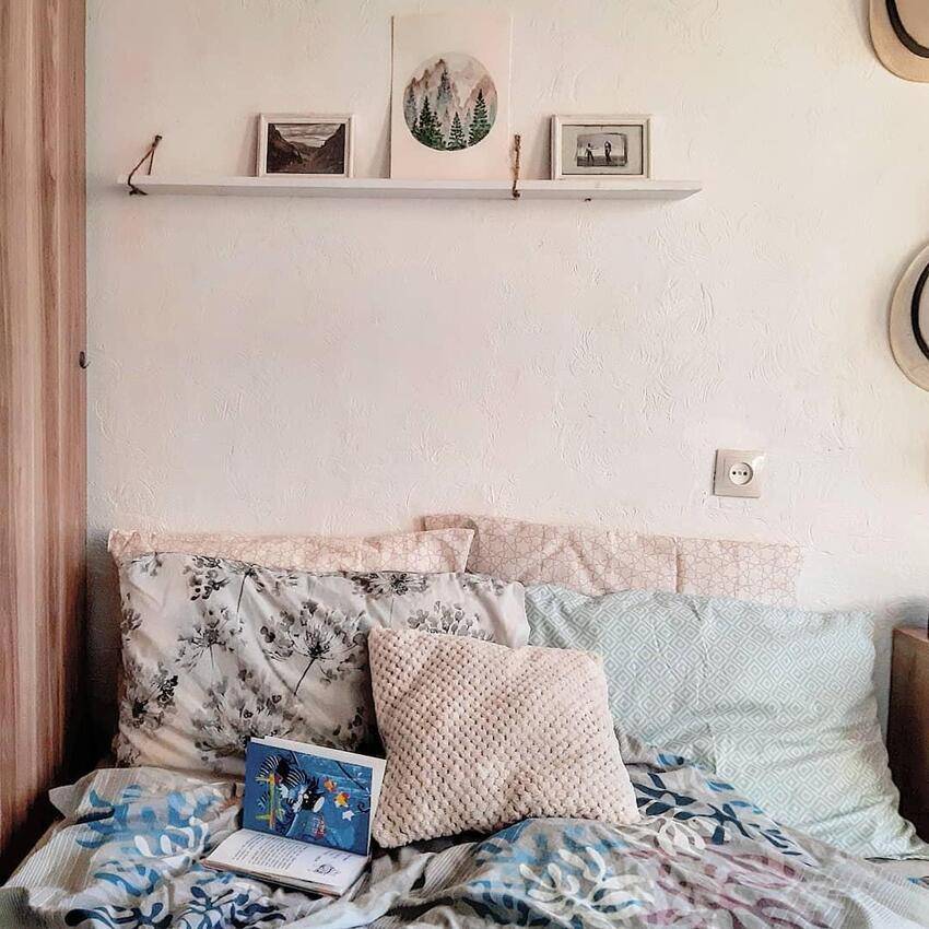 - в небольшой комнате следует отказаться от массивного изголовья кровати, на стене лучше разместить небольшие полочки для хранения мелочей и декора;