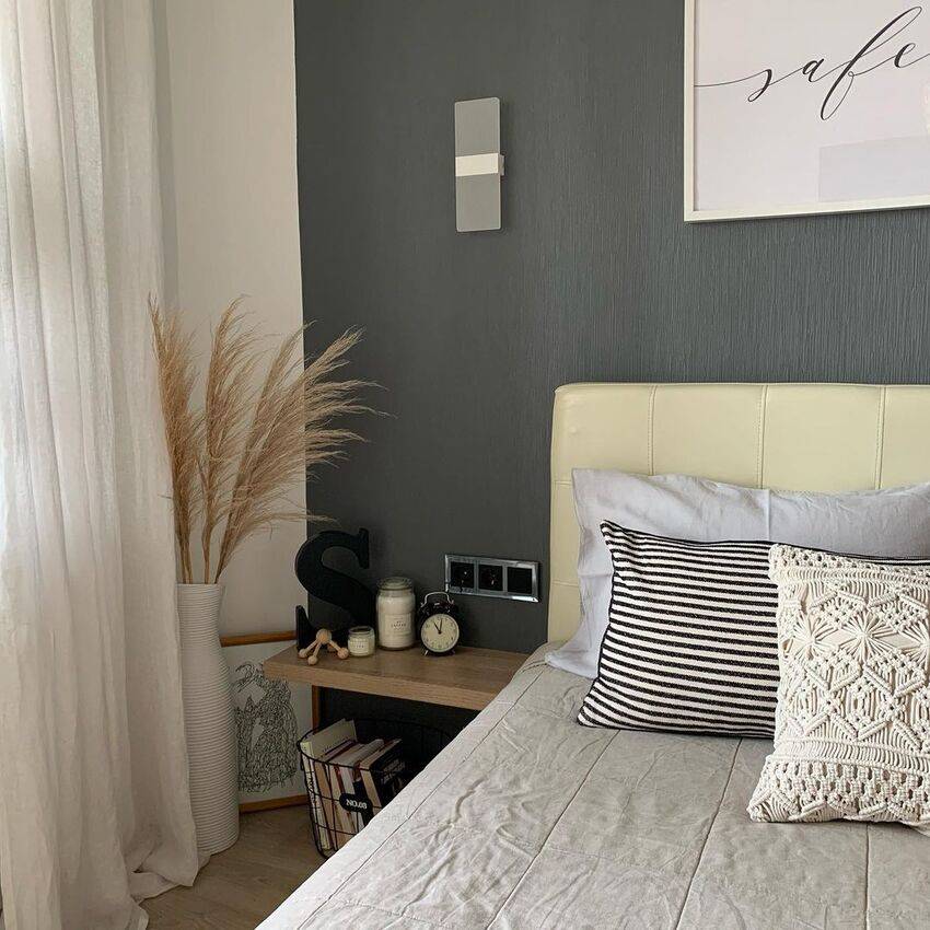 Серый цвет – универсальное решение для тех, кто любит яркие эксперименты. Все дело в том, что данный цвет служит прекрасным фоном для насыщенных оттенков. Например, он прекрасно сочетается с голубым и розовым, желтым и синим цветом. Кроме того, на его фоне легко выделить красочные живые растения, белоснежную кровать и оригинальные светильники.