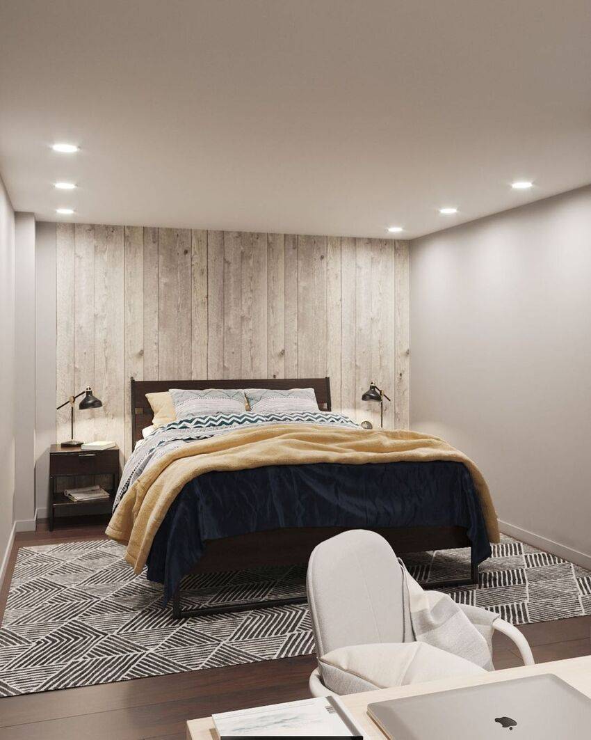 Отличным решением будет создание акцентной стены из ламината. Этот актуальный и модный тренд прекрасно впишется в интерьер спальни.