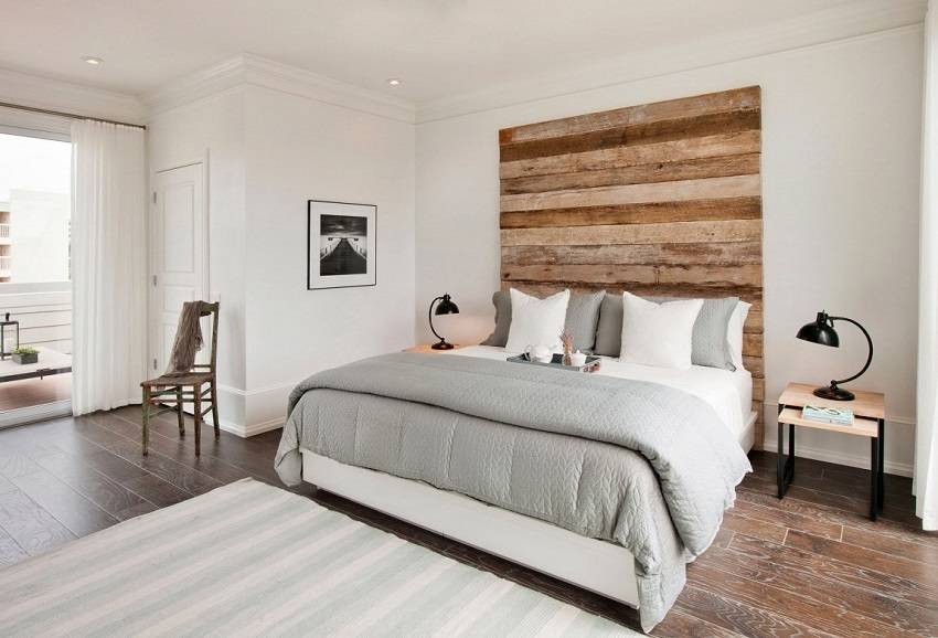 - белоснежные стены и потолок, в сочетании с натуральным деревом на полу, будут зрительно увеличивать спальню;