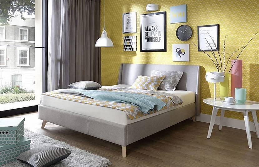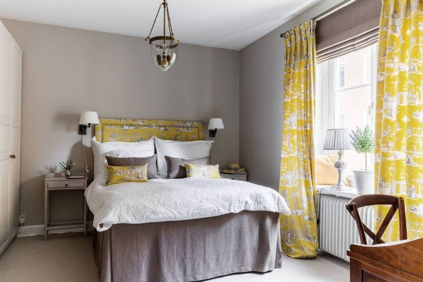 Этот яркий цвет стал использоваться в скандинавских интерьерах из-за нехватки естественного солнечного света. В спальне рекомендуется использовать теплые оттенки типа горчичного, цвета сливочного масла, банановой кожуры, кукурузный, золотистый.