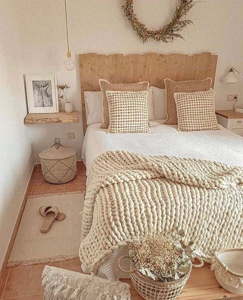 В таком пространстве органично смотрятся вязаные пледы, вазочки лаконичных форм из глины на прикроватных тумбочках.