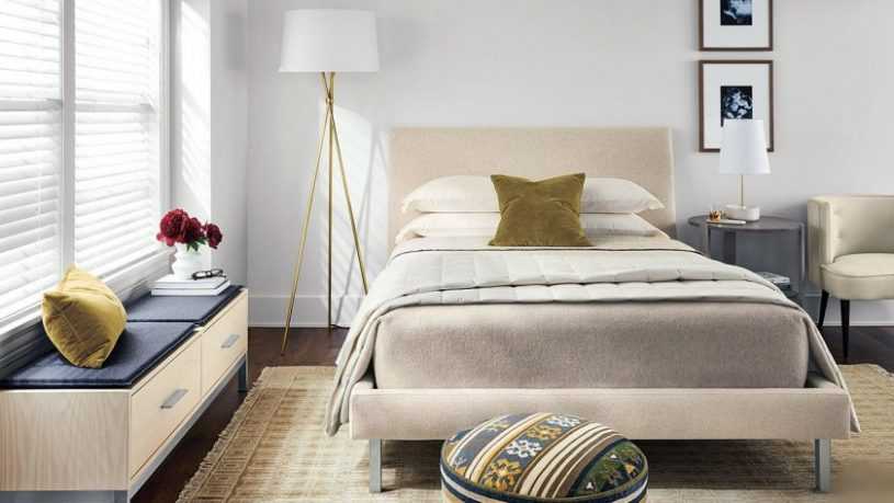 Это самое важное правило для спальни в хрущевке. Для обстановки выбирайте только необходимую мебель. Для экономии места можно купить кровать с выдвижным ящиком, в котором можно хранить постельное белье.