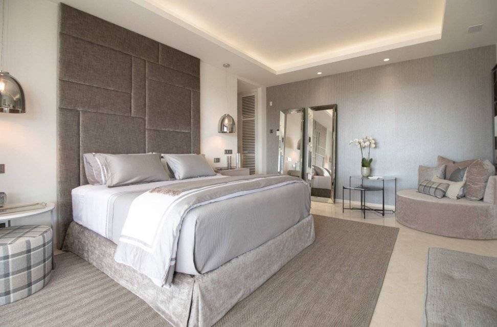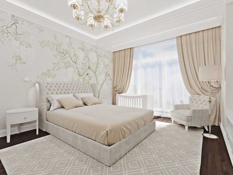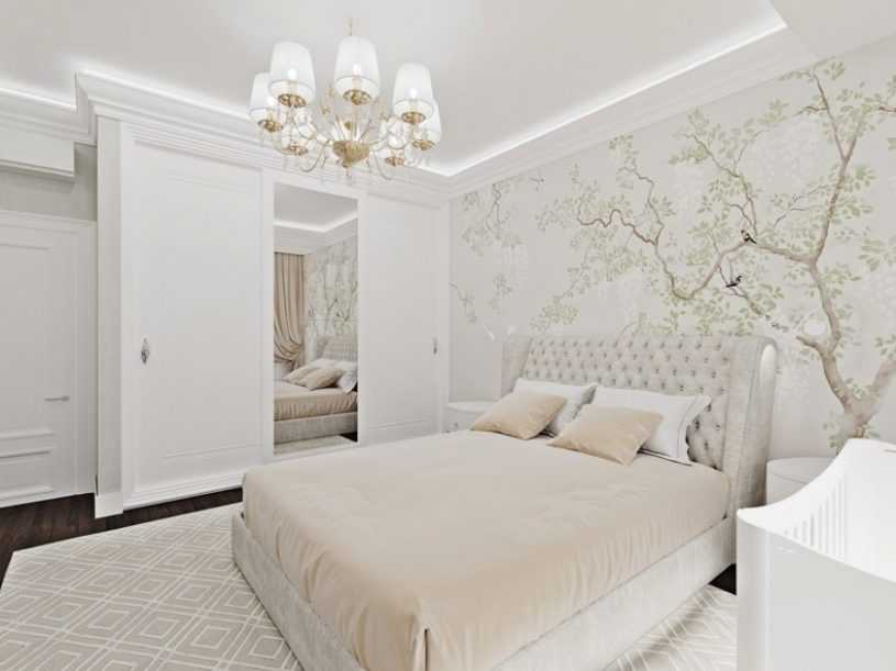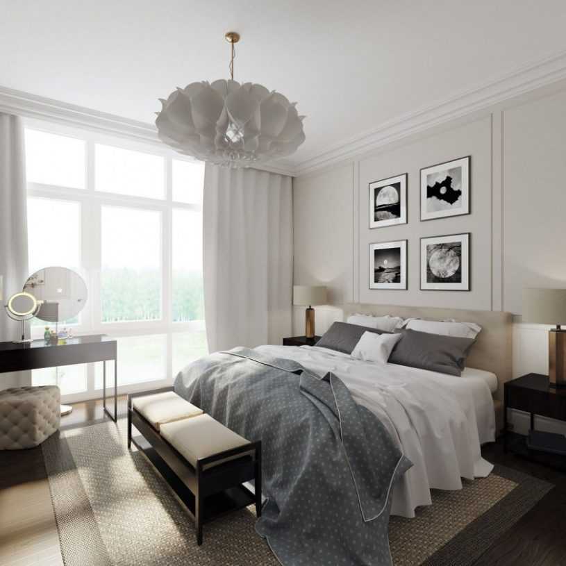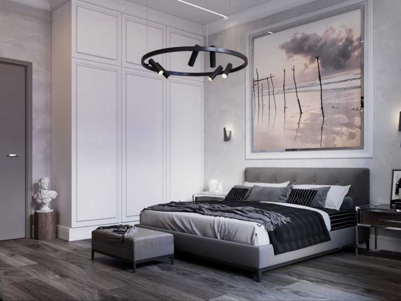 Допускаются акценты в виде картин, изысканных торшеров, керамических фигур, комнатных растений. Постельное белье должно быть шелковым либо хлопковым, без заметных принтов. Точечное светодиодное освещение по периметру и прикроватные бра с матовыми молочно-белыми плафонами помогут создать спокойную атмосферу и настроиться на безмятежный сон.
