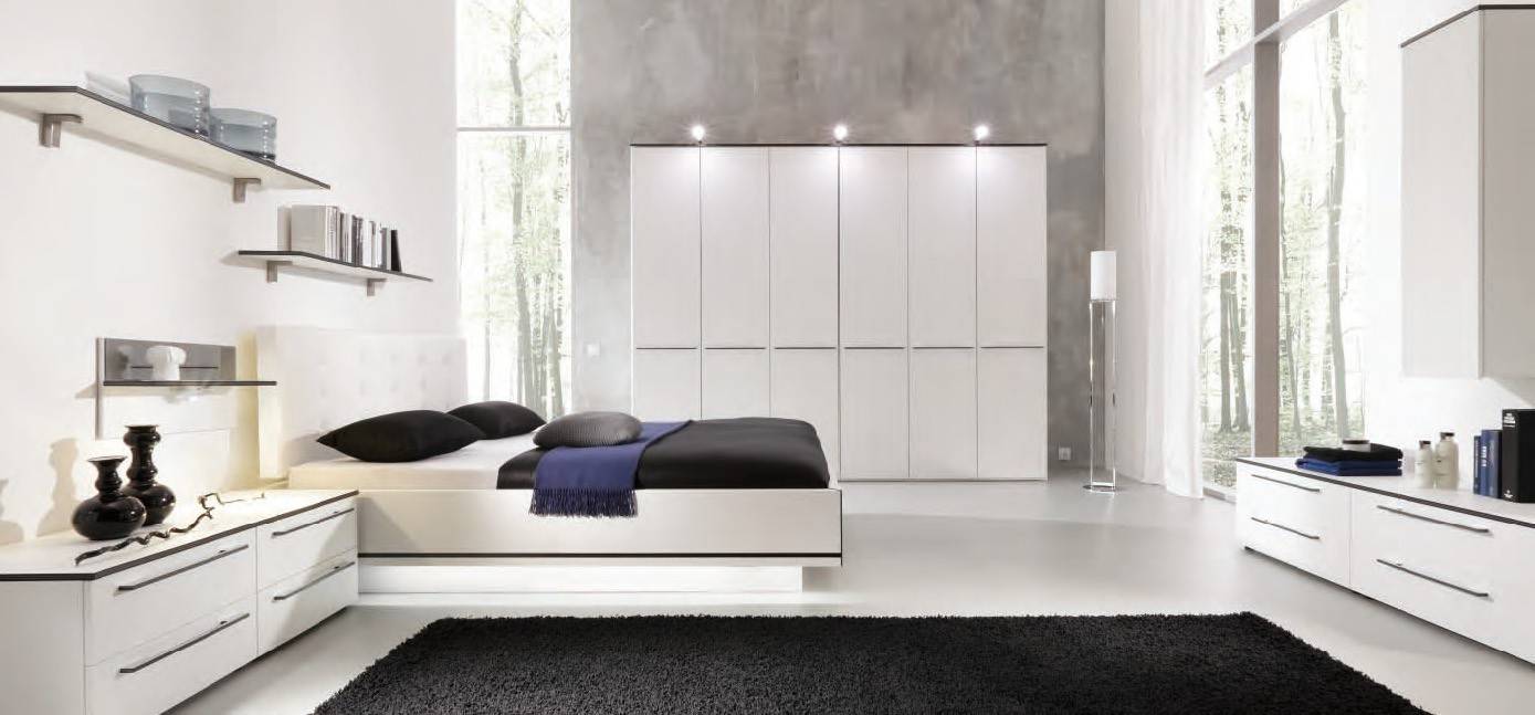 Спальню оформляют в нейтральных тонах. Обычно главным становится белый цвет, и к нему уже добавляют бежевый, черный, серый. Яркость дают фиолетовые, черные и красные аксессуары. Стены оклеивают однотонными обоями, пол укладывают линолеумом с ненавязчивым узором, ковролином либо виниловой плиткой.