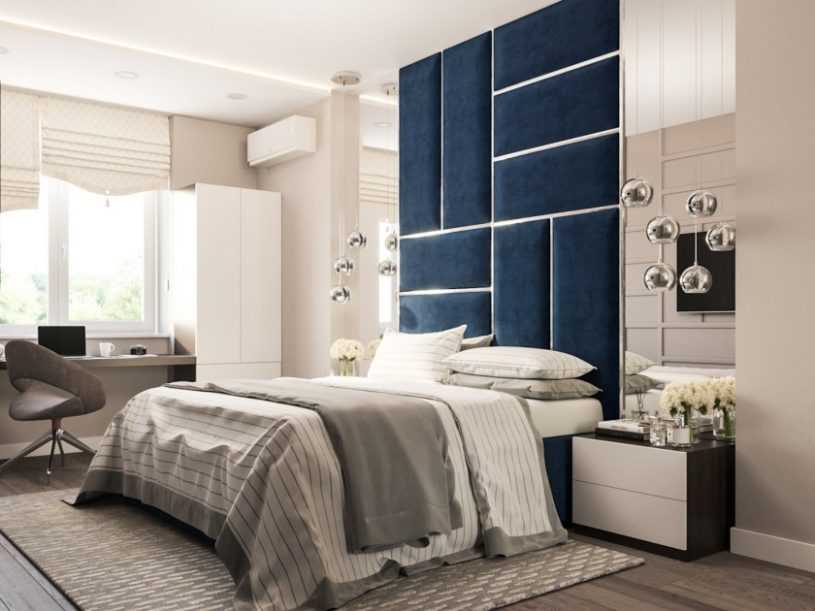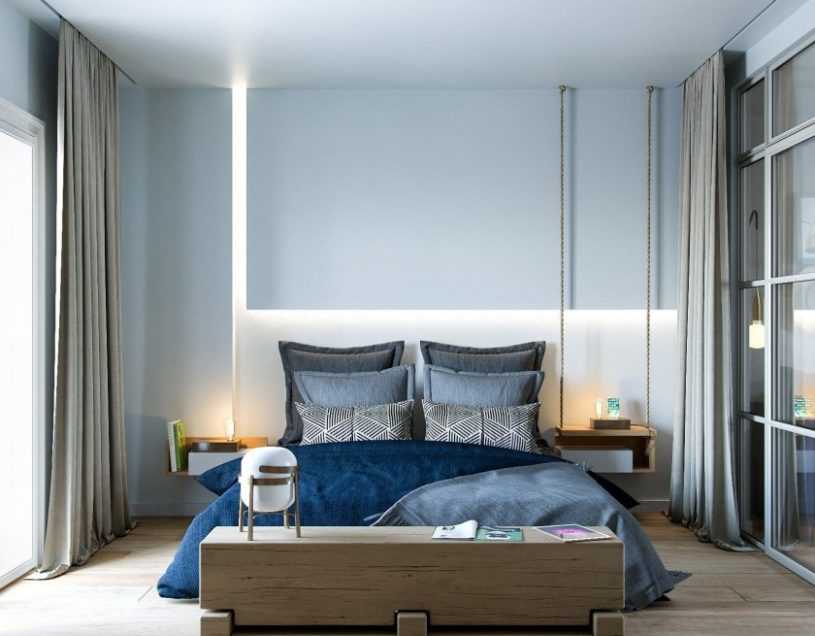 Многогранные оттенки синего, к примеру, бирюза, сапфир или синий с серым отливом, создадут в спальне некое ощущение морской свежести.