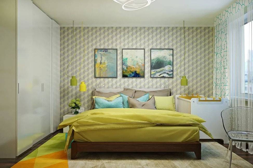 Жёлтые оттенки наполнят комнату солнечным светом и теплом, что так актуально для спален, расположенных на северной стороне.