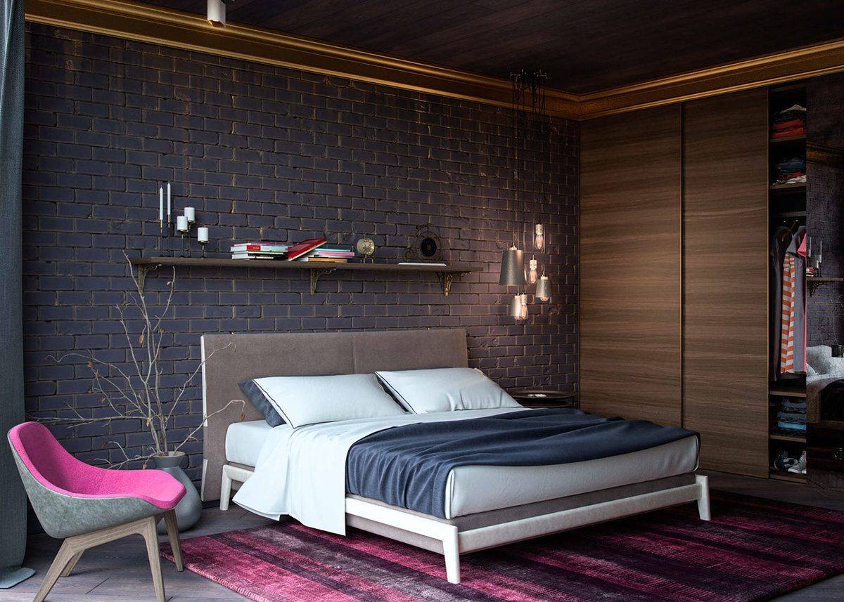 Другое решение — кирпичная стена в вашей спальне. Однако следует помнить, что эта идея будет работать в действительно больших помещениях. В малых спальнях кирпичная стена может визуально уменьшить пространство еще больше. Если комната отдыха и сна не очень большая, можете выбрать кирпичные акценты, например, полосы.