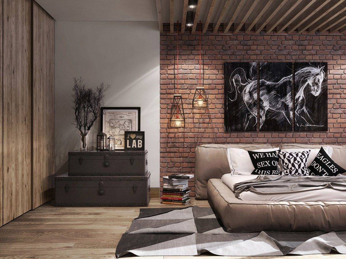 Акцент на спальном месте, наличие грубой штукатурки и деталей с кирпичной кладкой на стенах подчеркнет особенности направления и сделает интерьер уникальным.