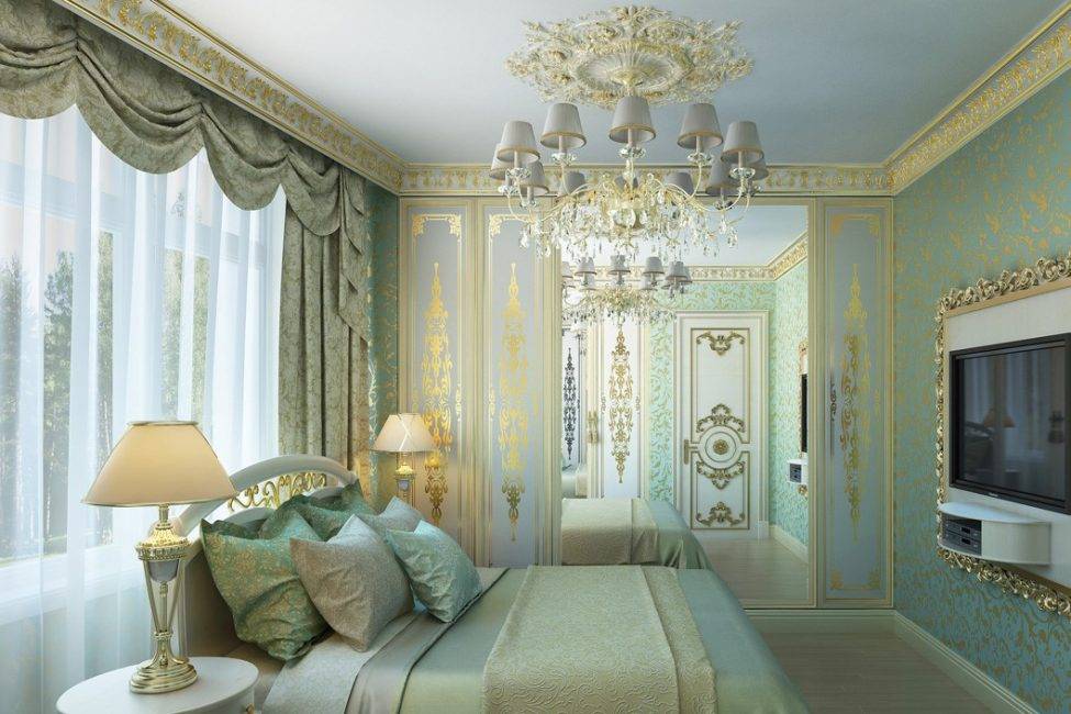Вместо громоздких шкафов в спальню устанавливают закрытые модульные гарнитуры. Помимо кровати и шкафа интерьер можно дополнить тумбами и милым декором. Если в основу дизайна взята классика, то осветительные приборы и аксессуары используются такие же как в классическим интерьере. Многорожковые люстры с абажурами или плафонами, подсвечники, антикварные статуэтки и картины.