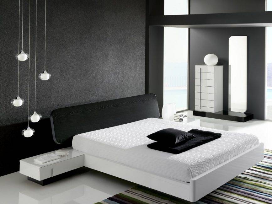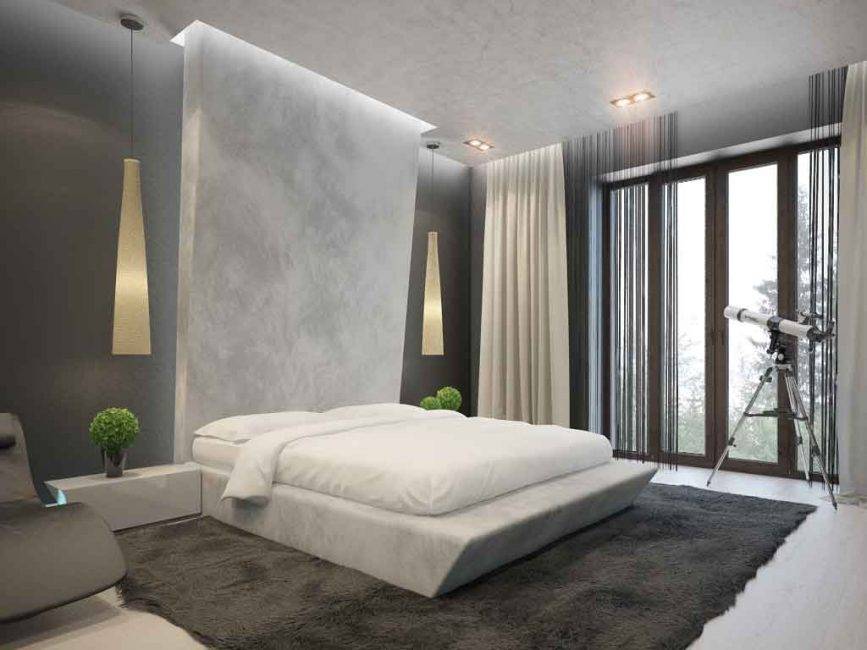 Так в спальне часто устанавливают низкие кровати на подиуме, при этом важно, чтобы она также как и другие предметы функциональной мебели сливалась по цвету со стенами. Выбирается не громоздкая, а легкая на вид мебель без резьбы и узоров
