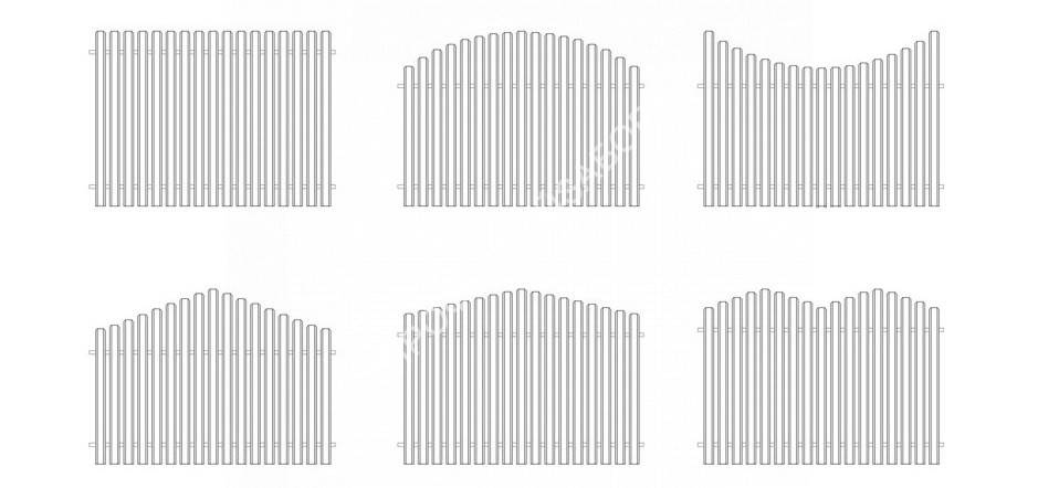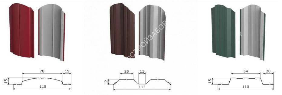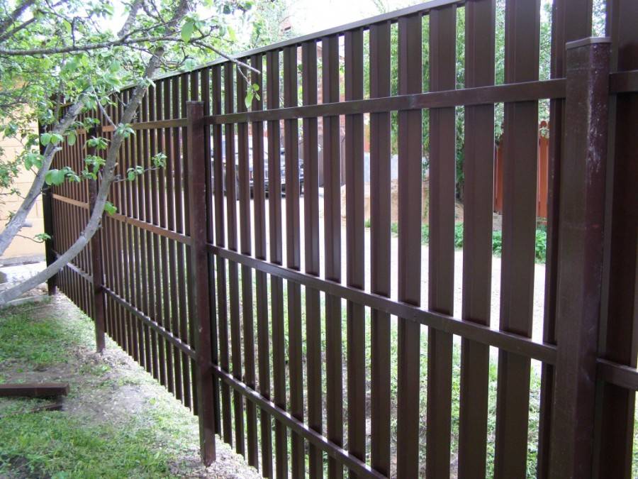 - металлические планки (штакетник) — форма профиля и толщина планок, их количество подбирается индивидуально в зависимости от типа будущей конструкции. Если планируется глухое ограждение, планок придется приобрести вдвое больше;