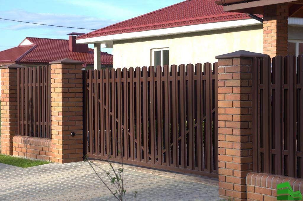 Наиболее распространенный вариант ограждения — кирпичная кладка, совмещенная с металлическим штакетником