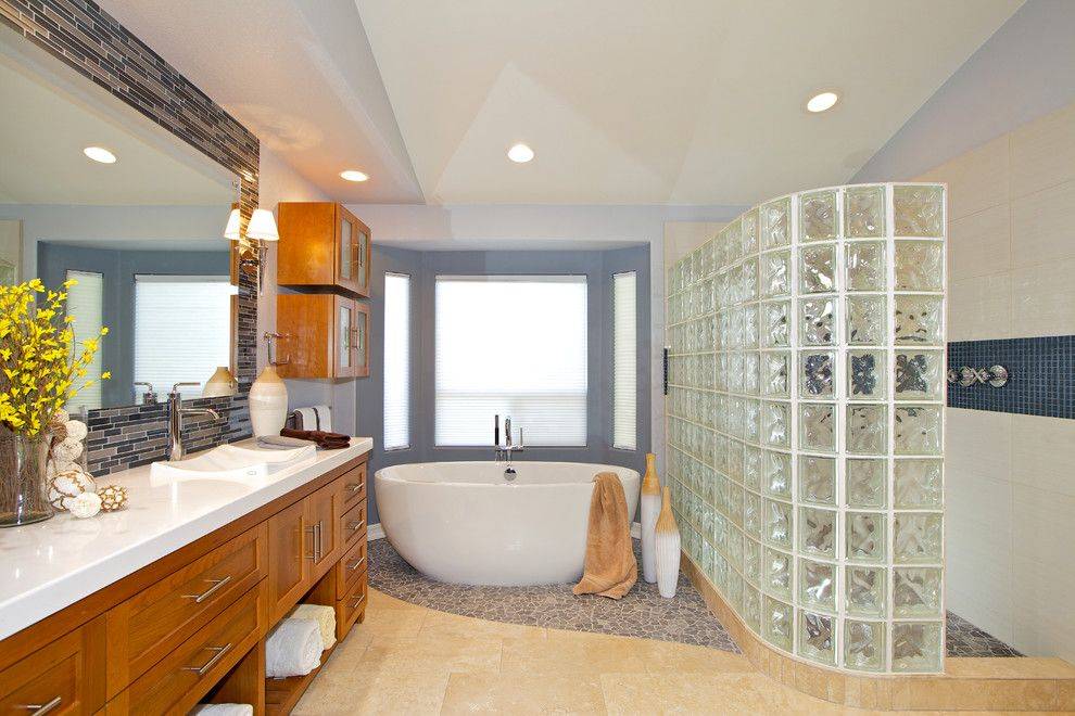 Форма перегородки может быть стандартной прямой, но используются и криволинейные варианты, которые придают интерьеру современность и оригинальность. Сегодня именно стеклоблоки применяются для ванных комнат, обеспечивая защиту от подглядывания, оставляя свободное проникновение света. Комбинируя стеклоблоки, можно добиться интересной и необычной игры света.
