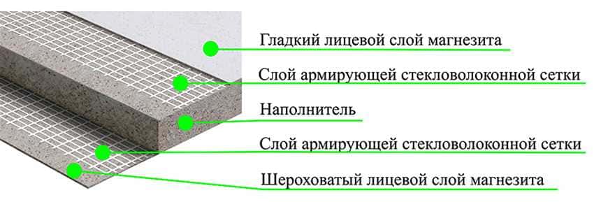 — верхний слой прочная глазурь из раствора магнезиального «молочка», толщина до 1мм. Это лицевая сторона стекломагниевого листа. — армирующая сетка (верхний слой); — далее формовочная масса состоящая из магнезита, мелкофракционных наполнителей. Толщина от 4-10мм в зависимости от толщины произведенного листа. — армирующая сетка нижний слой; — формовочная масса нижний слой. Этот слой проходит этап производственной шлифовки, в результате готовый лист имеет отличные показатели по точности соответствия заявленной толщине.