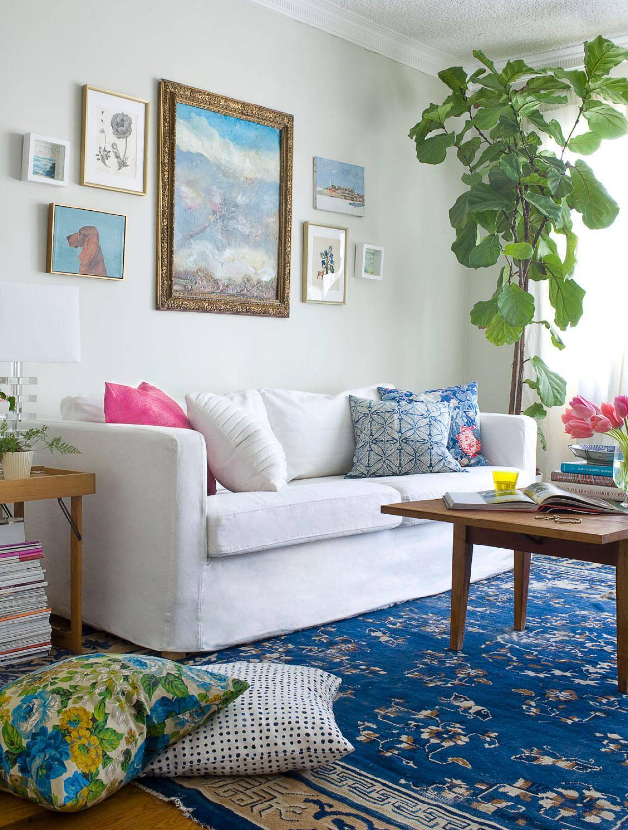 Гостиная в стиле бохо шик с яркими подушками