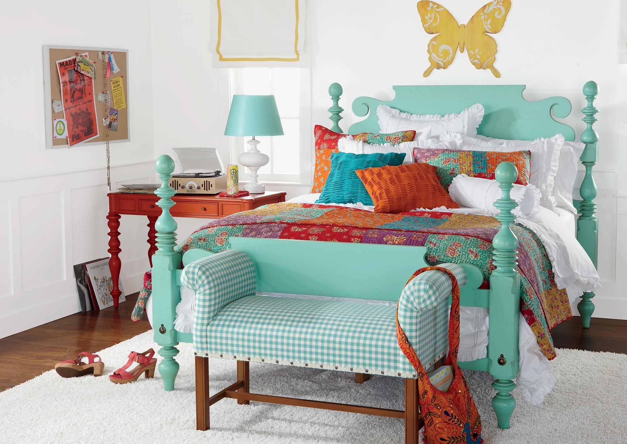 Что можно использовать для создания интерьера в стиле бохо: рукодельные лоскутные одеяла, подушки, балдахин-шатёр, цветные гирлянды, пуфы, бескаркасные лежаки, множество рисунков на стене, смешные, аляповатые люстры и даже гамак или подвесное кресло.