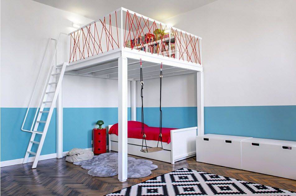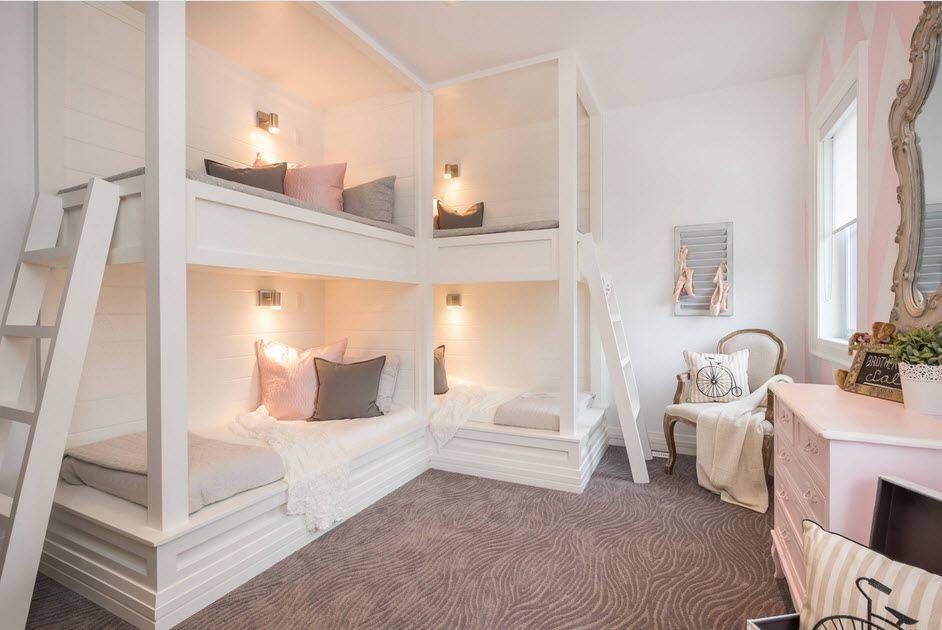 Интерьер детской комнаты должен отличаться от спальни, здесь есть сочетание ярких красок, узоры. Мебель окрашена в белый цвет, потолок оштукатурен или деревянный, кровать с ножками и кованным изголовьем.
