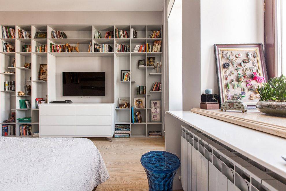 Чем проще геометрия помещения, тем лучше для contemporary. Стандартная комната панельной многоэтажки – это идеальное место для создания подобного интерьера. А в него уже легко будет вписать простые понятные линии, формы – скажем, прямоугольную современную мебель, технику, а также фото, картины, статуэтки.