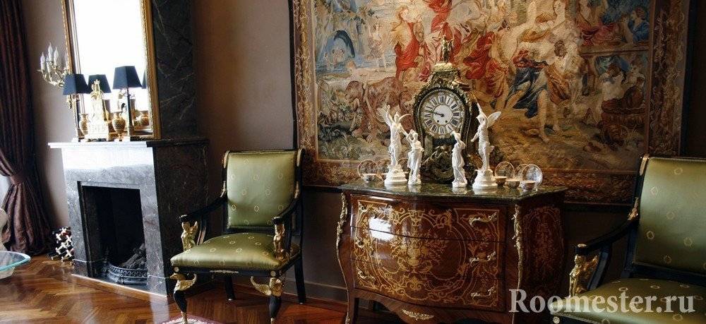 Такой же дорогой текстиль стоит выбрать для объемных штор с ламбрекенами и декоративных подушек на диванах. Наряду с настоящим камином, огромным зеркалом и старинными картинами он станет отличным украшением гостиной или спальни. В качестве элементов декора в интерьере также могут присутствовать стилизованные под старину шкатулки, настенные часы, вазы, пепельницы и статуэтки. А любители искусства обязательно должны повесить на стену хотя бы одну картину в позолоченной раме.