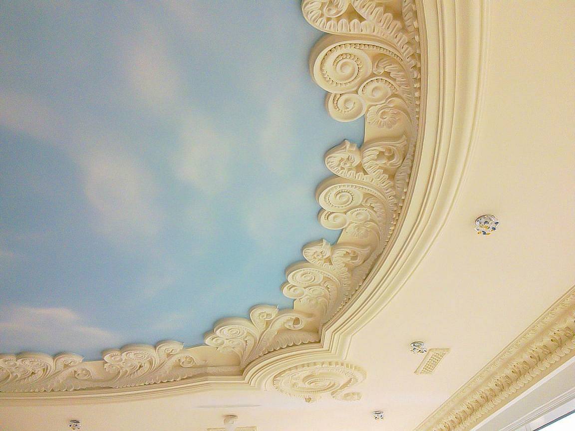 Если потолки круглые – классический вариант с лепниной подойдёт как нельзя лучше. Цветные изображения пасторальных сценок, ангелов и цветов украсят потолок. Вокруг рисунков будет располагаться лепнина в виде роз, купидонов и абстрактных узоров.