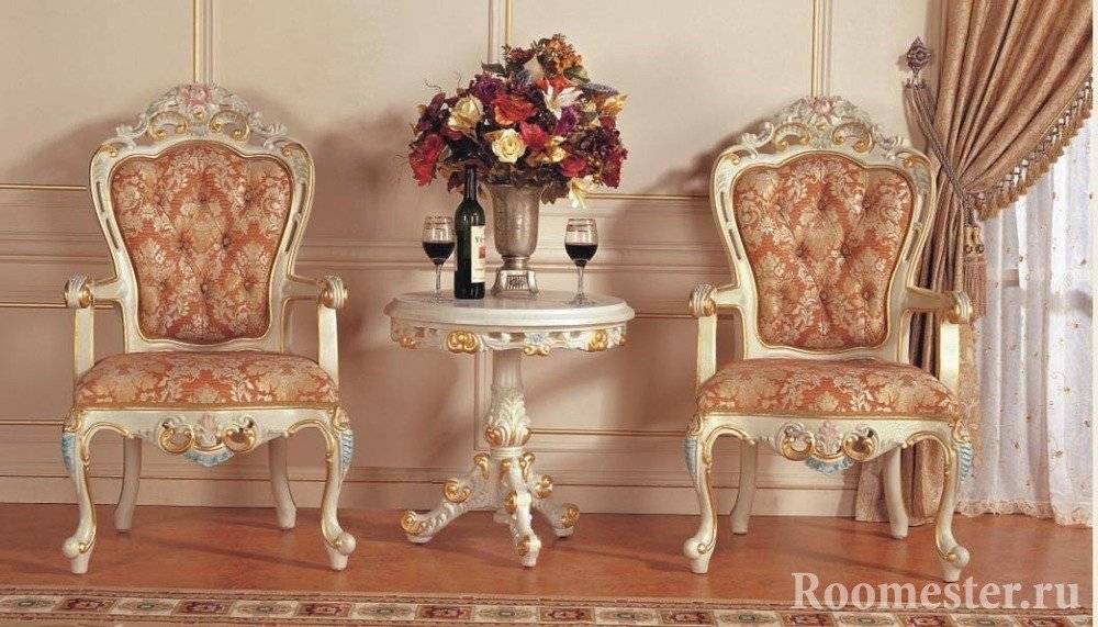 Выбор правильного гарнитура представляет собой важный этап в создании уникального дизайна. Выбеленная древесина, дополненная изысканной резьбой, тонкие изогнутые ножки стульчиков и столов, узорчатая обивка, обильное количество позолоченных элементов и виньеток – именно эти предметы помогают воплотить в жизнь атмосферу подлинной роскоши и невероятного изящества.