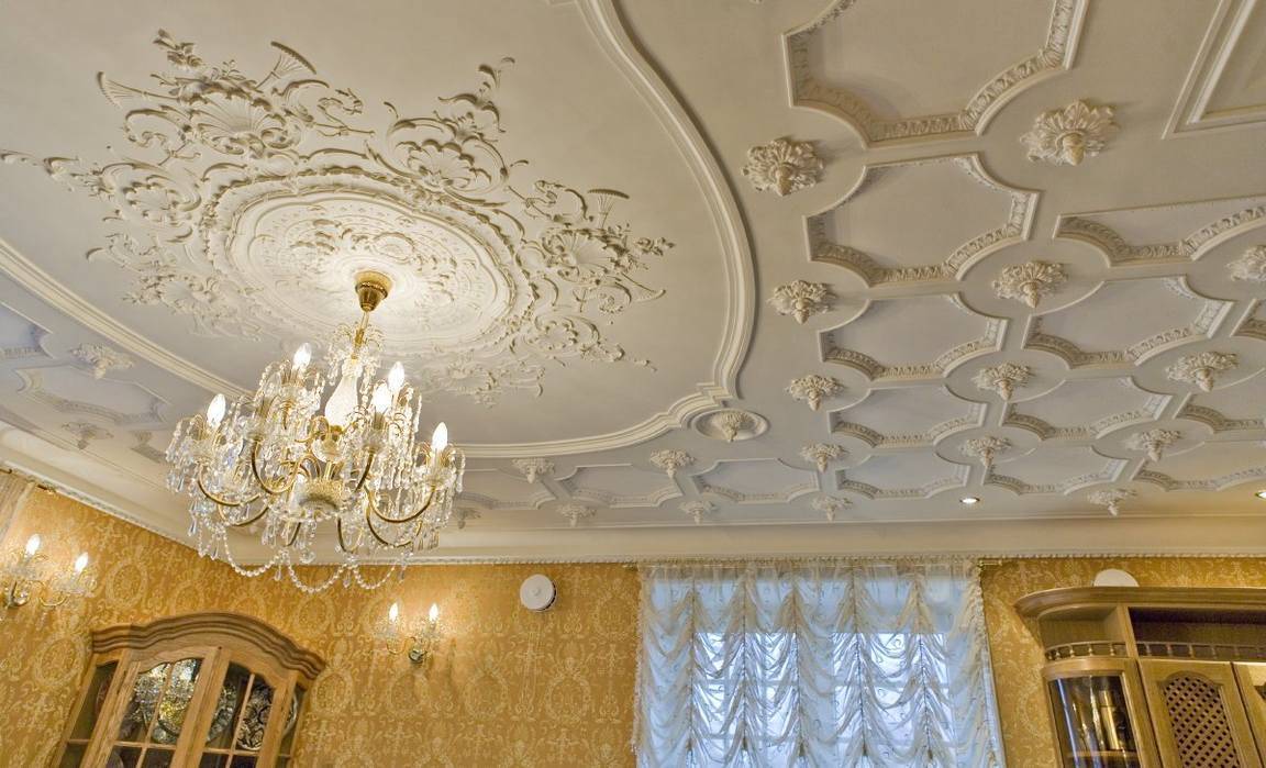 В каждой такой секции будет свой узор или мотив, выполненный в золотом цвете. Белый потолок и золотистые объемные узоры создадут обстановку роскоши в любой комнате.