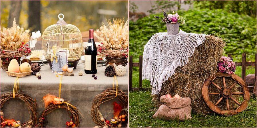 Весь зал украсьте, как того требует тематика Рустик – полевыми и садовыми цветочками, но ставьте их не в вазы, а в ведра, банки или бутылки. Можно также использовать для оформления воздушные шарики пастельных тонов, гирлянды из бумаги и ветки деревьев.