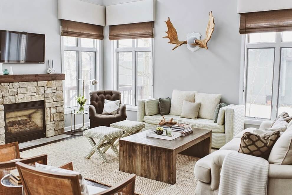 Отличным декором станут предметы в виде плетеных корзин, старых сундуков, картин с изображением животных или лесных пейзажей. Обстановку можно дополнить охапкой дров или журнальным столиком, выполненным из обычного пня.
