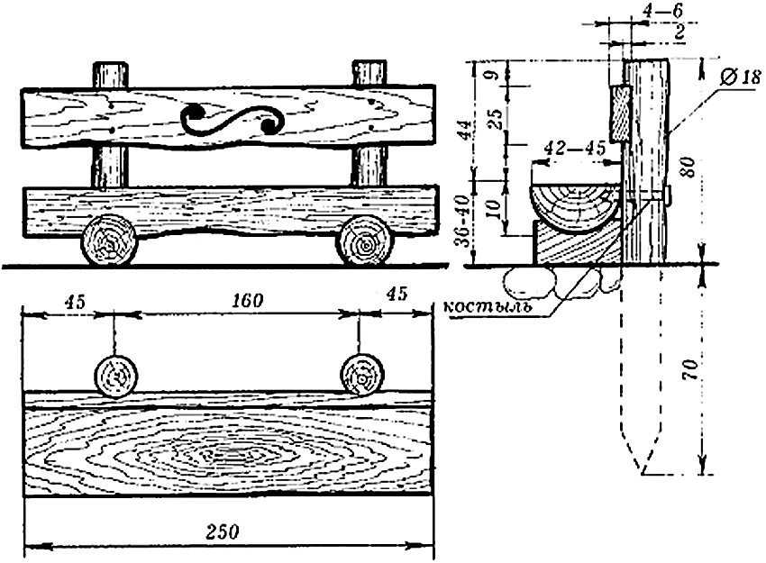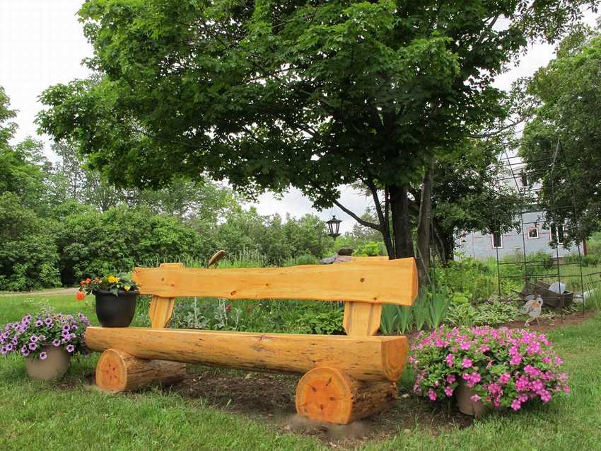 - если вы хотите сделать скамейку без спинки, последуйте приведенной ниже схеме, прорубите в верхней части одного из бревен два паза и поместите в них часть, предназначенную для сидения.
