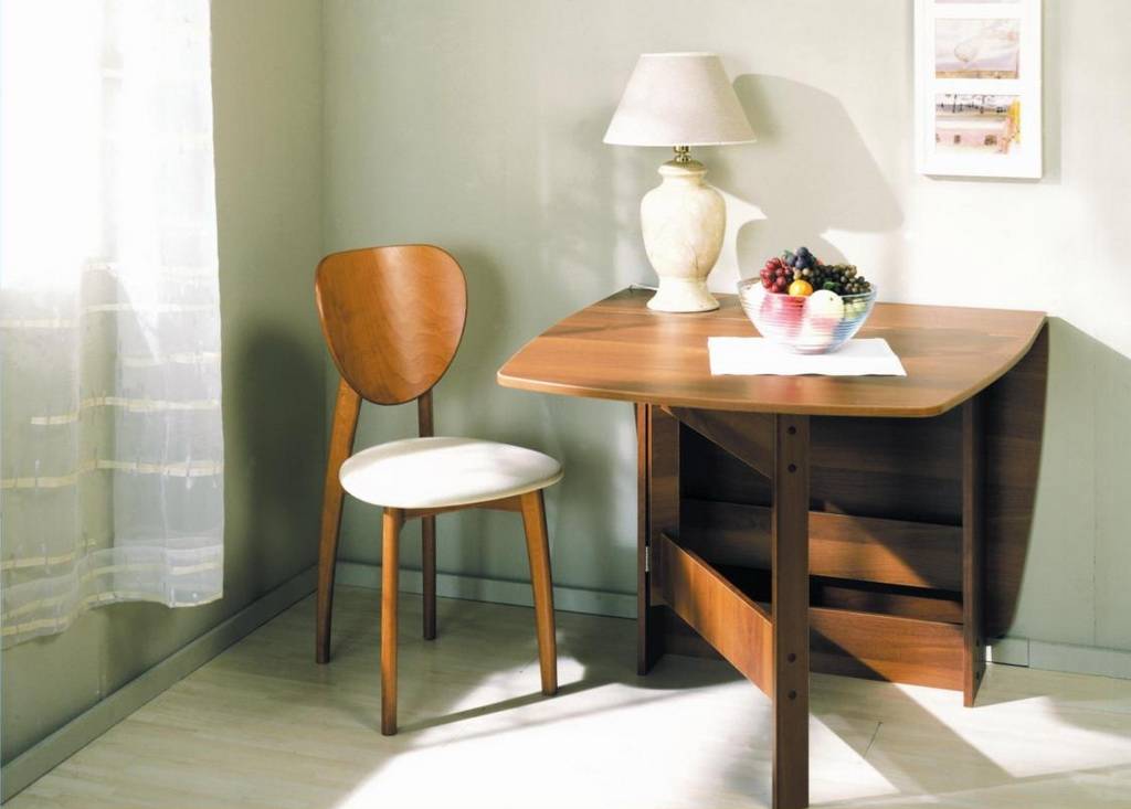 - Стол-трансформер для кухни. Преимущество его, в первую очередь, в экономии пространства – на кухне обычно происходит достаточное большое количество действий и движений, и чересчур громоздкая мебель не будет там уместна. А вот небольшой столик-подставка для мебели, раскладывающийся в стол на шесть-восемь персон или встроенная в стену столешница будут вполне подходящими вариантами.