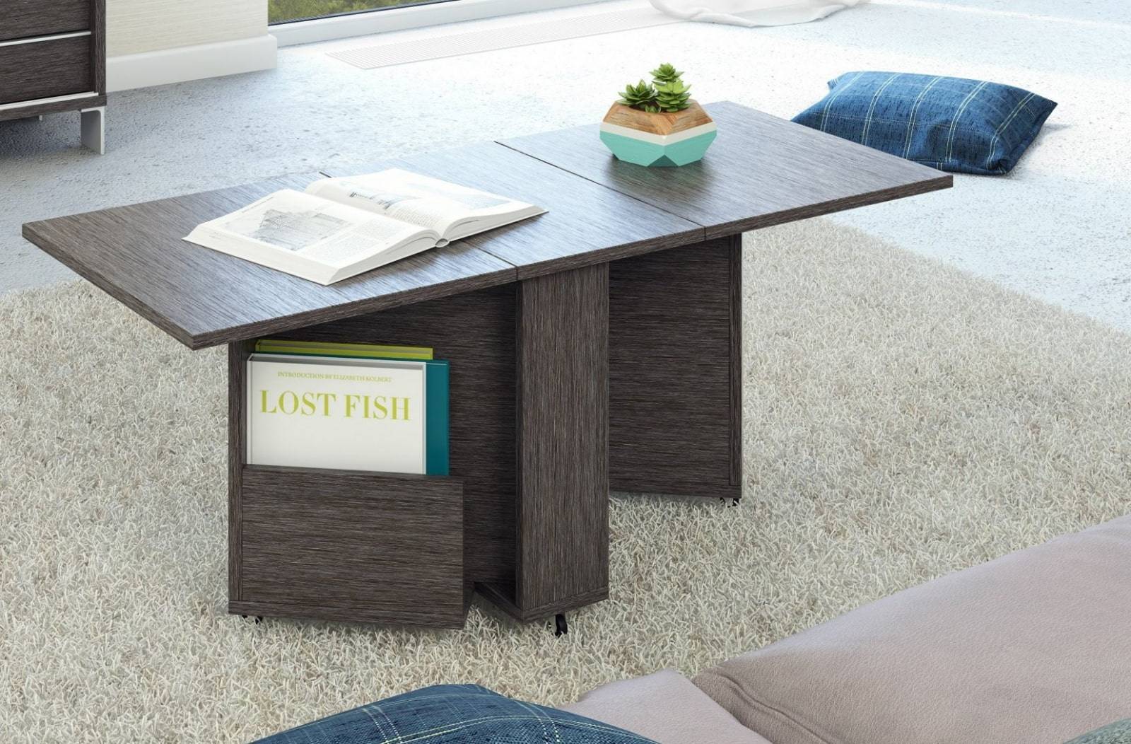 - Могут изменяться в размерах и габаритах. Как правило, они раскладываются или раздвигаются за счет наличия регулировочного механизма, например, книжки, в случае с которым поднятая столешница открывает дополнительный отдел внизу, который можно использовать для хранения посуды или сервировочных приборов. Одним движением руки журнальный столик превращаться в обеденный либо наоборот. Другой вариант, при котором меняется размер столешницы или высота ножек, поможет в случае неожиданных гостей или наличии дома маленьких детей, которые не могут сидеть высоко.