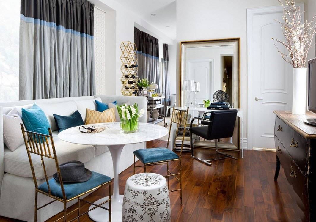 Дизайн небольшой гостиной с обеденным столом формируется за счет особых подходов к зонированию помещения. Они ориентированы на визуальное расширение пространства за счет особого размещения элементов мебели и декора, изменяющего восприятие человека.