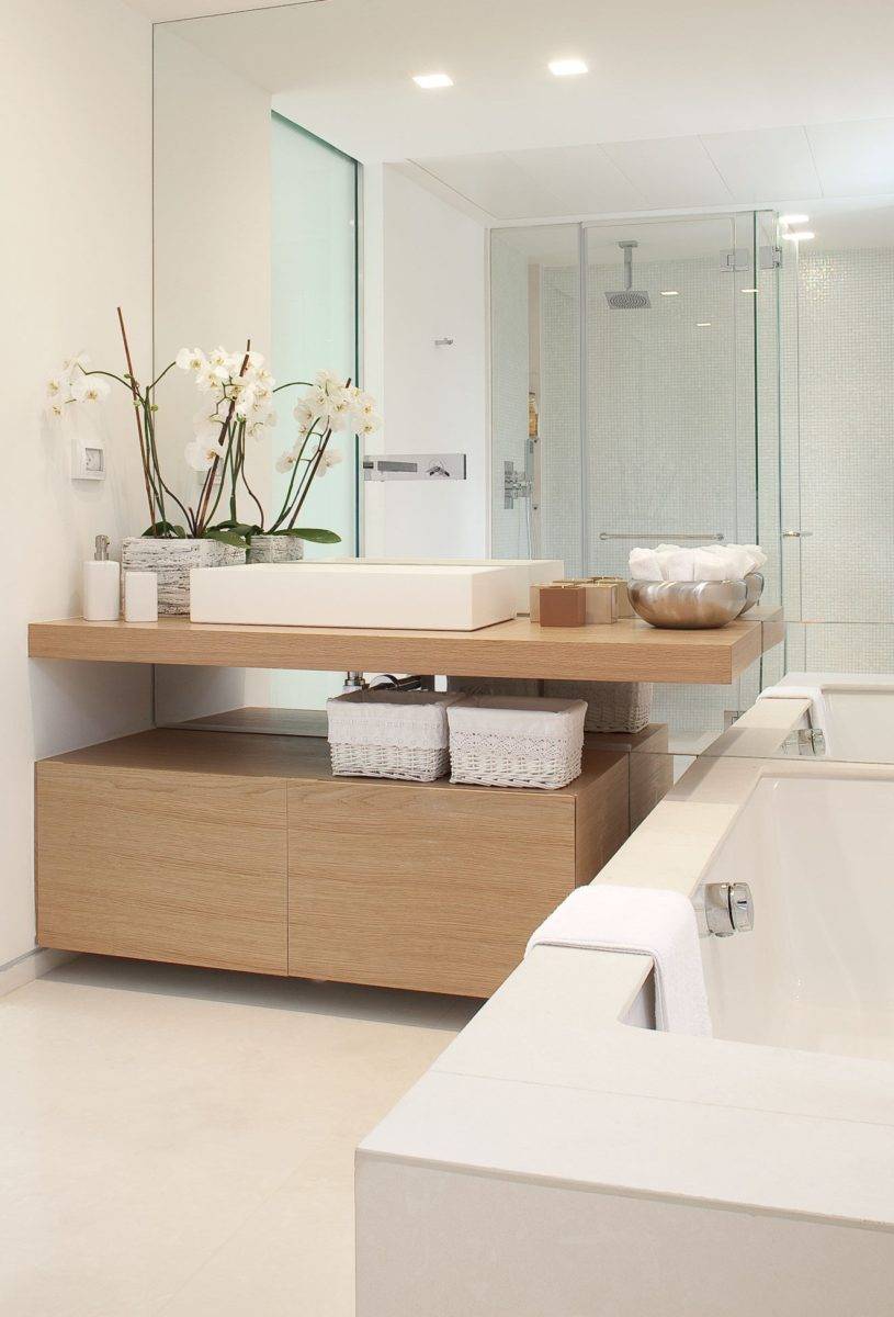 Добавляя деревянные элементы в ванную комнату, вы создаете дружелюбный интерьер. Столешница или другая отделка из дерева приятны на ощупь. Обратите внимание, что деревянная столешница для ванной комнаты находится в центре. Это также первый элемент его оборудования, с которым сталкиваются гости. Поэтому стоит сделать в ванной комнате сильный акцент в виде столешницы из настоящего дерева!