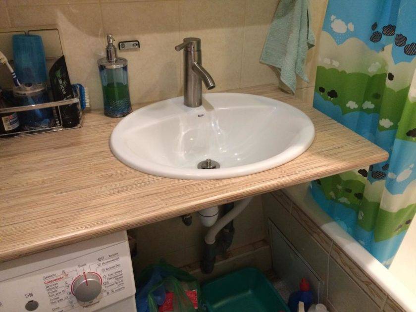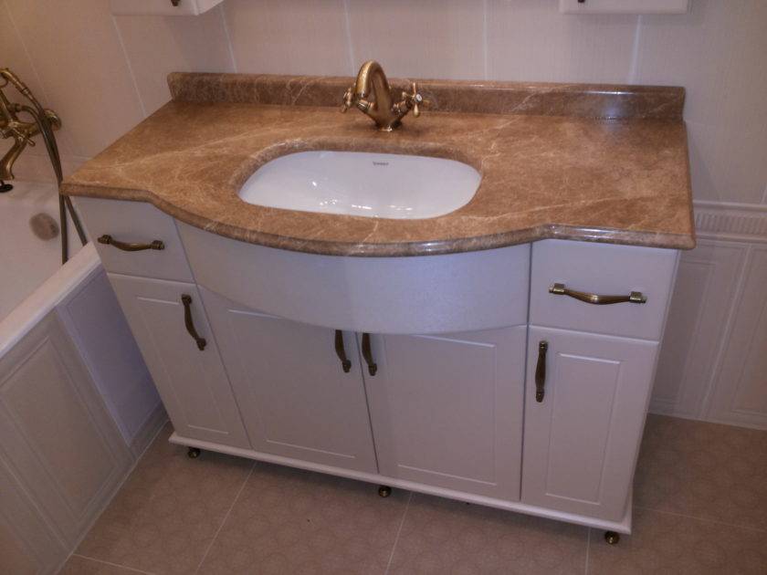 Столешницы могут быть выполнены из дерева, МДФ или стекла. Существует целый ряд искусственных столешниц в ванную.