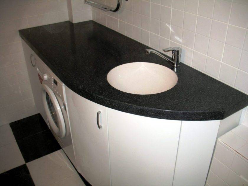 Популярный вариант в современных интерьерах — столешница для ванной из искусственного камня. Искусственный камень представляет собой композитный материал, который делается из крошек натуральных минералов и полимеров. Такой материал ничем не отличается от натурального.