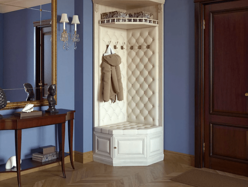 Некоторые элементы угловых прихожих могут иметь мягкую кожаную или тканевую обивку. Это касается встроенных пуфов и открытых вешалок для одежды.