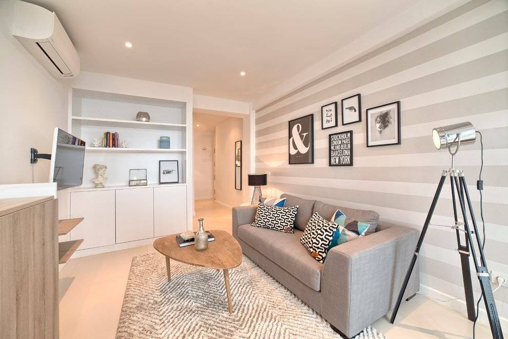 Поклейка фотообоев поможет скорректировать неправильную форму комнаты, а также переключить внимание на оригинальное оформление. Объемное изображение поможет зрительно вытянуть квадратную комнату или уравновесить узкое помещение гостиной