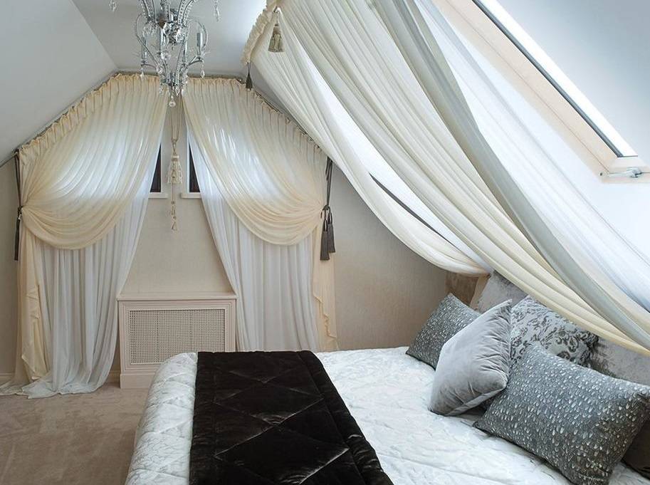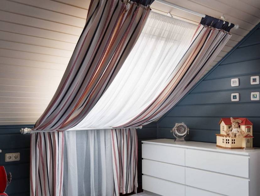 Мансардные окна с наклоном в любой градус идеальны для того чтобы заказать пошив штор с люверсами или смастерить их самостоятельно. Там декоративный карниз делается на стандартной высоте и чуть ниже окна, за который заправляют край шторы.