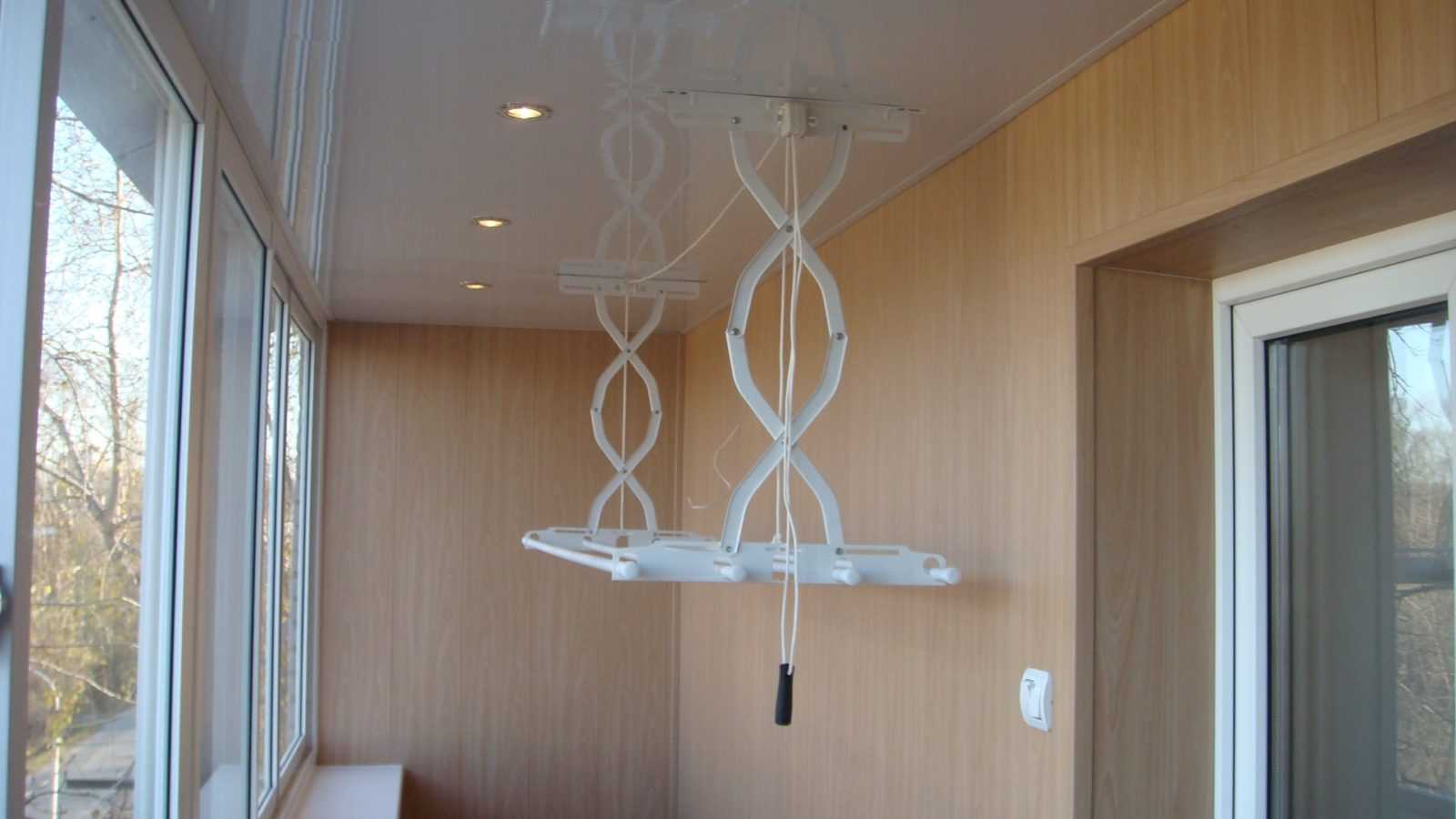 Этот вид устройств для сушки белья много в чем похож на настенные сушки, но в данном случае крепления размещаются на потолке. Из этого можно увидеть очевидное преимущество таких сушилок – они занимают минимум полезного пространства балкона, а в то время, когда не используются, складываются и становятся практически незаметными. Самые распространенные потолочные устройства – подъемные конструкции по типу лианы, в которых можно спускать перекладину на нужную высоту, чтобы было удобно развешивать стирку.