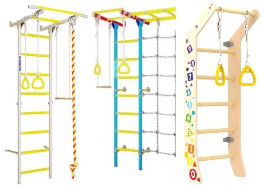 Для дошкольников комплектация спортивных комплексов выглядит несколько иначе, т.к. на этом этапе развития ребёнок ещё не занимается силовыми упражнениями, а больше играет. Именно для этого в комплекты шведских стенок, выпускаемых для малышей, включают следующие элементы и спортивные снаряды: