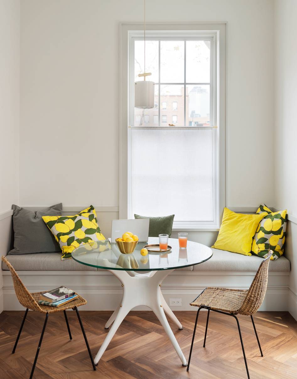 Для обивки оптимальным вариантом является натуральная кожа. Материал отвечает всем требованиям кухни, но значительно повышает цену изделия. Искусственные аналоги способны стать достойной заменой. Они долговечны, просты в уходе, представлены разными цветами и фактурами.