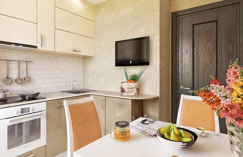 Есть несколько способов размещения телевизора в интерьере угловой кухни: