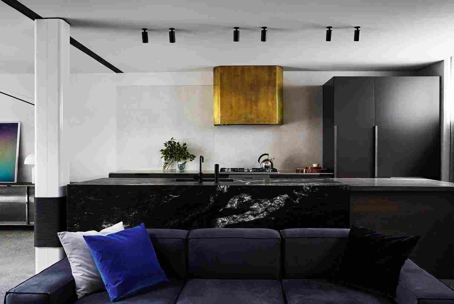 На фоне черной стены оригинально смотрится светло-бежевая корпусная мебель
