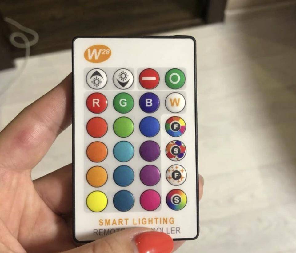 Кнопка, включающая белый теплый свет. И две кнопки регулирующие обжую интенсивность освещения. Именно они являются самыми востребованными в при обычном использовании. Для вечеринок имеются еще четыре режима: мигающий белый, мигающий цветной, плавное и ступенчатое изменение цветов.