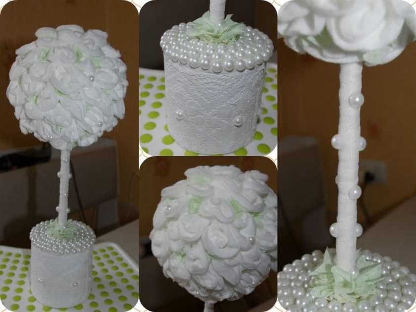На первый взгляд такое решение может показаться неактуальным, но в конечном итоге, данная композиция не уступает другим своим аналогам. Ватные диски часто украшают пурпурными или нежно–кремовыми крупными бусинами и ажурными лентами. Топиарий в таком исполнении смотрится очень нежно и романтично.