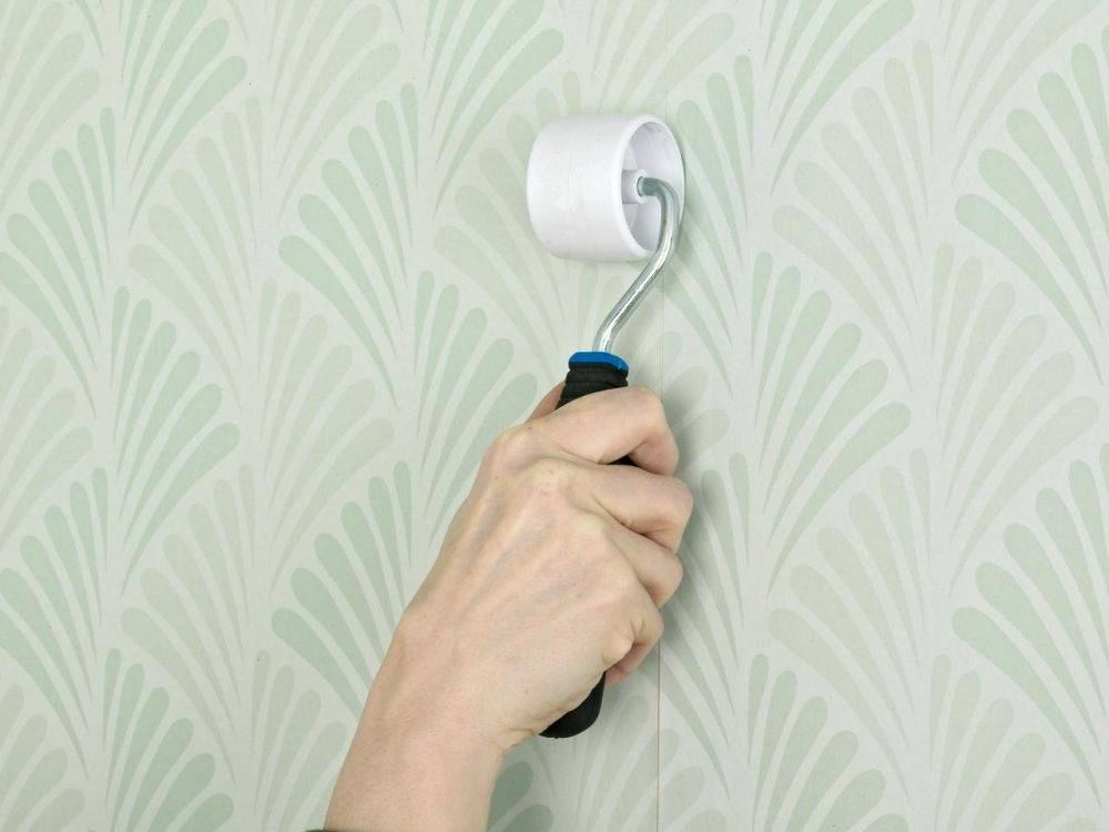 Полотно разравнивается чистым обойным валиком, выгоняя лишний клей в сторону, где обоев еще нет. Категорически запрещается использовать для этого шпателя, тряпки, острые металлические предметы или инструменты, которые могут повредить рисунок или верхний виниловый слой обоев.