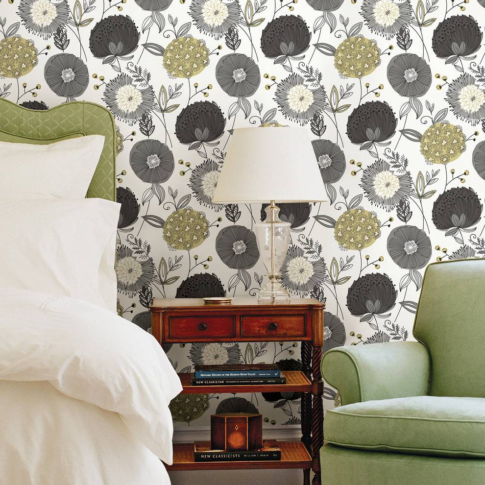 Текстиль с таким же принтом, как и на обоях, сделает дизайн более законченным
